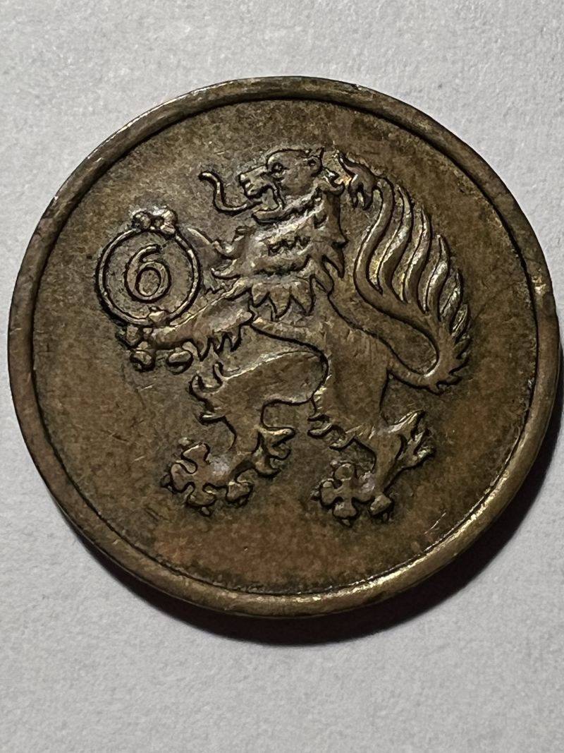 Die Vorderseite zeigt einen Löwen mit der Ziffer 6, auf der Rückseite ist nur die sechs